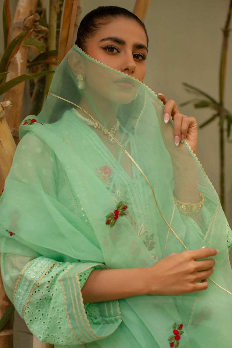 Cotton net shirt with hand embroidery and lace detailing on front and sleeves with chikan border, paired with straight pants.